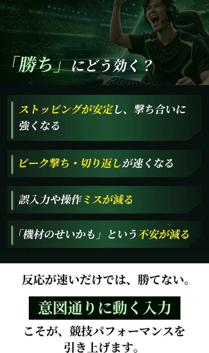 ゲーム中の操作を意図どおりにコントロールしやすくなり、快適なプレイやタイピングをサポートします。