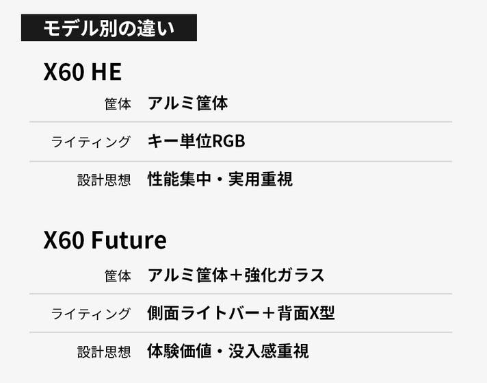 ただし、このモデルの価値は派手さそのものではありません。入力性能を犠牲にすることなく、没入感や所有体験を上乗せする。それが、X60 Futureです。