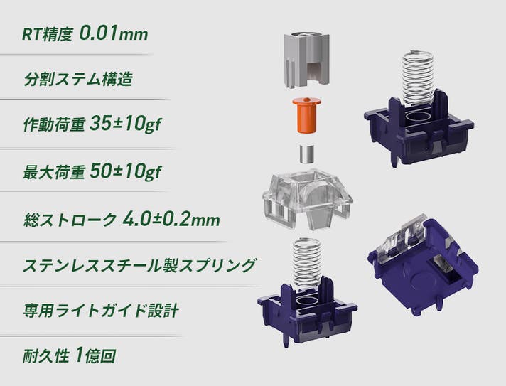 最大0.01mm単位で入力を検知する高精度設計により、キーの微細な動きを正確に捉えます。
