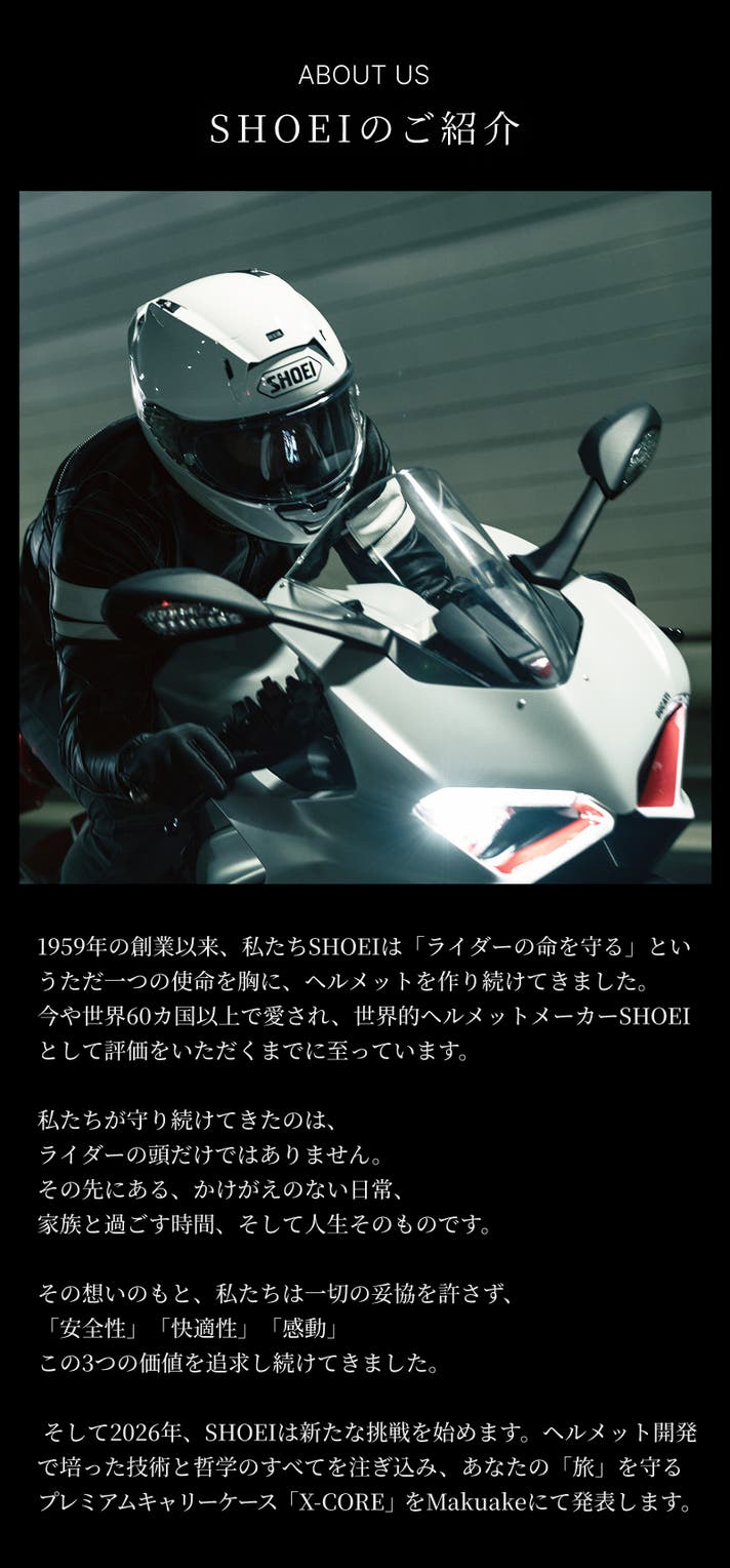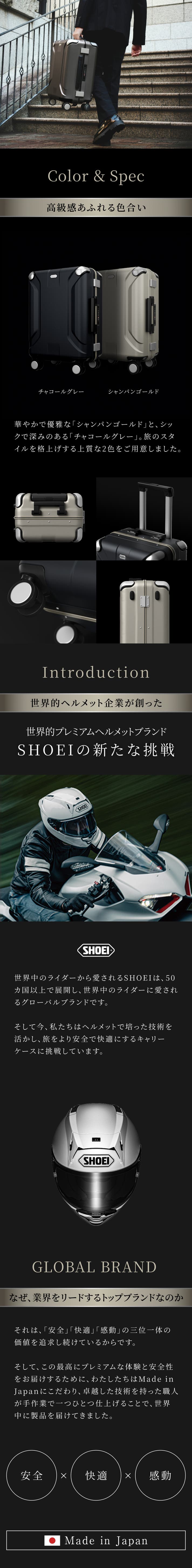 「Makuake(マクアケ)」は、実行者の想いを応援購入によって実現するアタラシイものやサービスのプラットフォームです。このページは、 プロダクトカテゴリの 「世界的ヘルメットブランド「SHOEI」の挑戦! 一生の旅を守るキャリーケース」プロジェクト詳細ページです。
