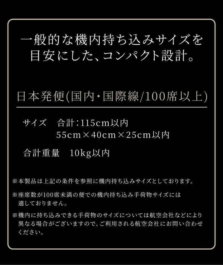 - 旅をもっと身軽に。一般的な機内持ち込みサイズを目安にした、コンパクト設計。