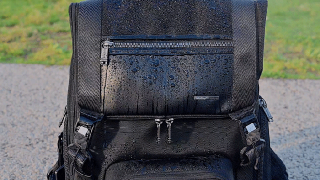 A:いいえ、バッグ自体は完全防水ではありませんが、使用している1680Dナイロンは撥水性です。※パターンの縫い目やステッチの穴など若干ではございますが水が染み込む可能性がございます。
