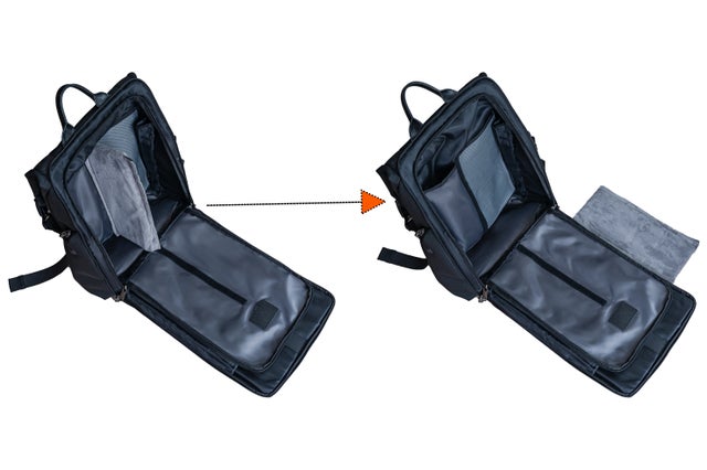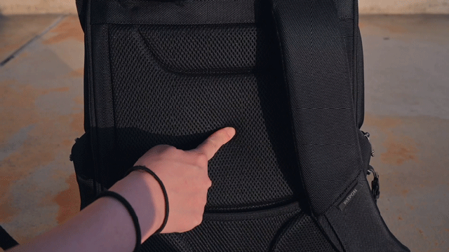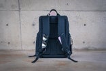バックパックの背面側には16インチまでのサイズが入るPC用の収納スペースがあります。ここはメイン収納とは別で仕切られているので、左右をセパレートして使用している時でも仕切りを気にせずPCを収納可能です。