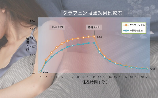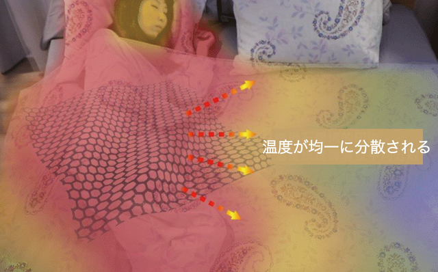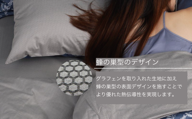 「グラフェン」は過去10年間に発見された新素材で、薄くて硬い特性を持ち、熱伝導率が速い素材です。いくつかの日用品に徐々に適用されてから、サーモスタット生地に良く使用されます。グラフェンと布を組み合わせたテクノロジーにより、優れた睡眠温度コントロールを実現します。