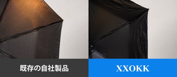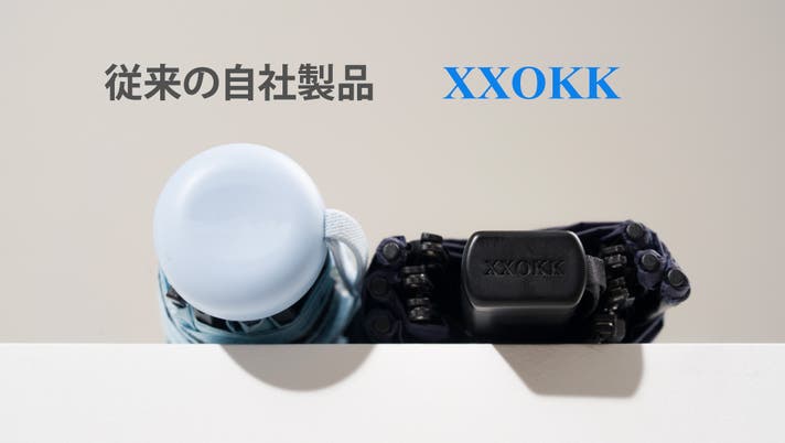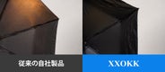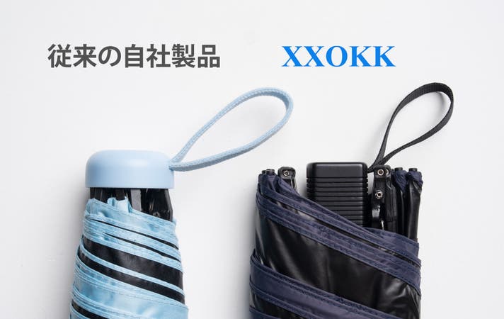 従来の自社製品は骨組みをまとめて収納できるフタの役割の方が強く、持ち手としてはとても不便で、収納しても飛び出てしまっていてコンパクトさが欠けていました。 XXOKKはそんな不便さをなくしよりコンパクトにするため、形を長方形にし持ち手をしっかり中まで収納できるよう設計しました。
