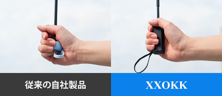 従来の自社製品は丸型で少し厚みがありましたが、XXOKKは長方形で厚みが薄いのでポケットやカバンにスッポリ納まります。