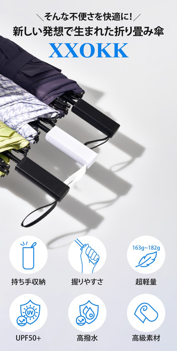 この商品を輸入しようと思った理由:折り畳み傘を使用する際、持ち手が細かったり、小さかったりと不便なことが悩みでした。しかし、XXOKK傘に出会い傘の悩みがなくなりました。超軽量で握りやすい長さなのはもちろん、持ち手が骨組みの間にすっぽり入る点には驚きました。実用性がありアイデアが溢れるXXOKK傘をぜひ皆様にも共有したく今回プロジェクトを行うこととなりました。