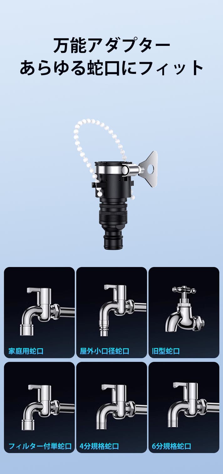 本製品は多種類の蛇口に対応するアダプターを採用し、家庭用から屋外まであらゆるにしっかりフィットします。