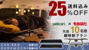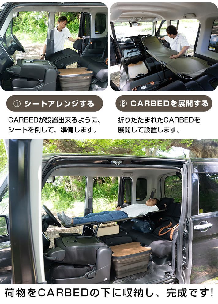 KURUMOCHIは、yadocariの車中泊ベッド CARBED と組み合わせることで、快適性がさらに高まります。CARBEDでしっかりとフラットな寝床をつくり、KURUMOCHIが体を包み込むことで、硬さ・冷え・隙間といった車中泊の悩みをトータルでカバー。寝心地と保温性、そして安心感まで整うことで、まるで「車の中に寝室ができた」ような快適さを実感できます。