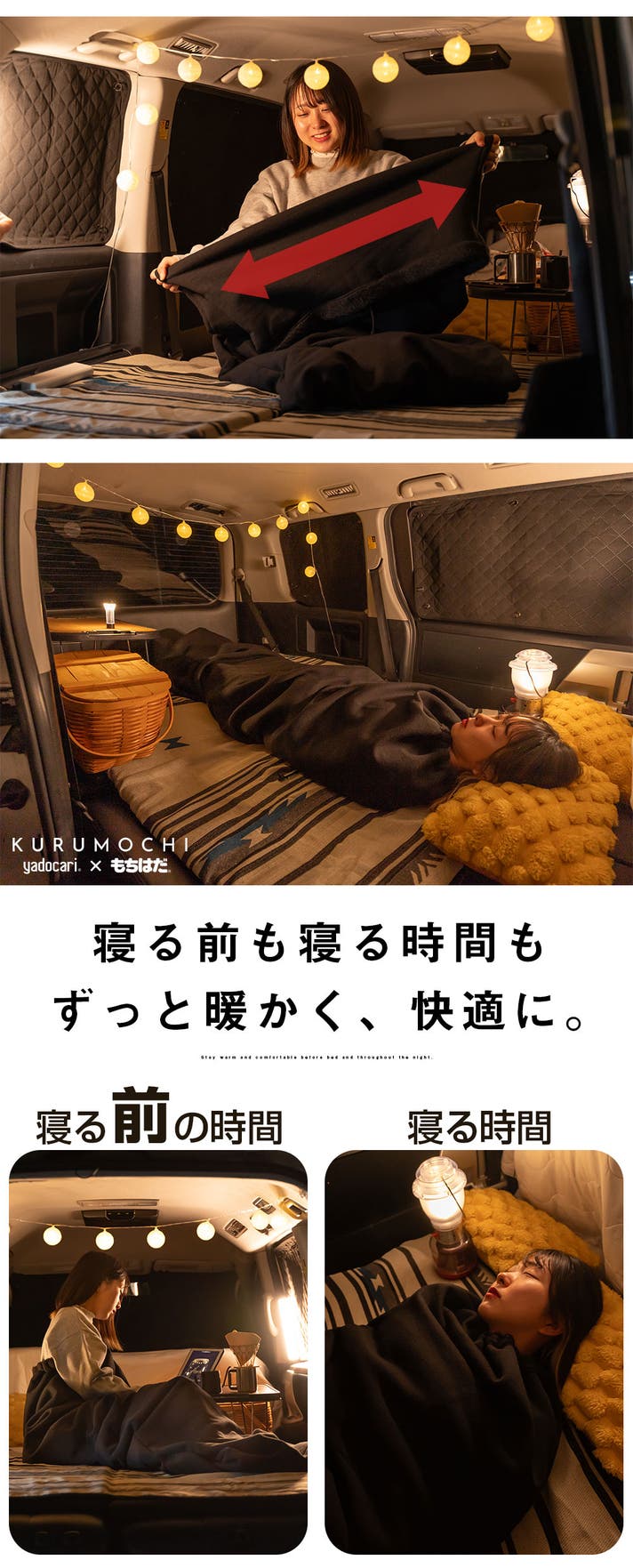 yadocariが重視したのは、“寝るまでの時間”をどう快適にするか。2本紐のスピンドル構造により、肩口の調節が可能。腕を外に出せるため、暖かさを保ったまま、スマホ操作や食事ができます。車中泊の夜を、ただ耐える時間から、くつろぎの時間へ。