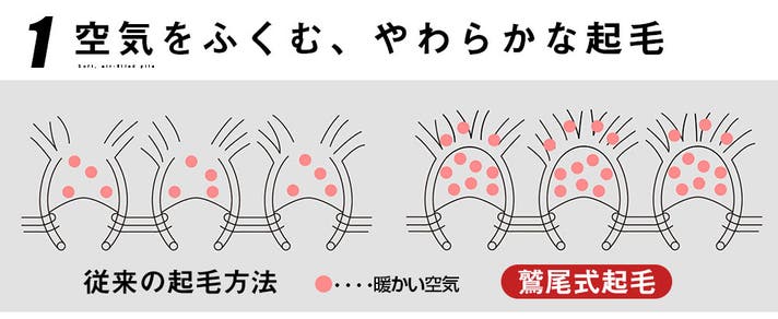 - 1970年誕生の技術「鷲尾式起毛」を採用。大量生産では不可能な、体温を逃がさない圧倒的空気層。