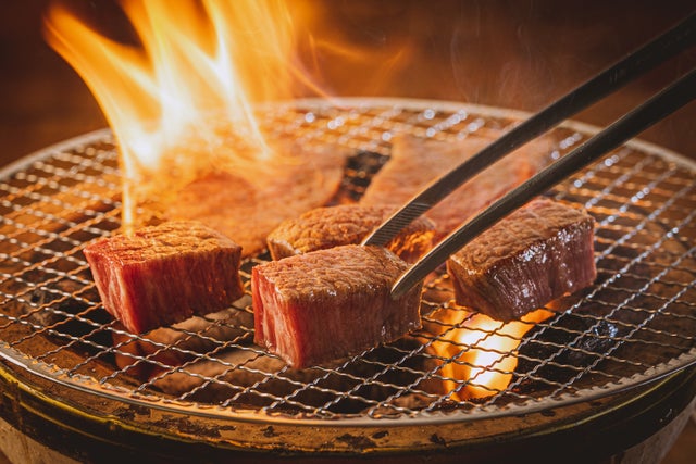 「三四郎」は、すべてお客様が七輪で肉を焼き上げるのに対し、「ゆうすい」では昔ながらの卓上ロースターで焼き上げるスタイル。