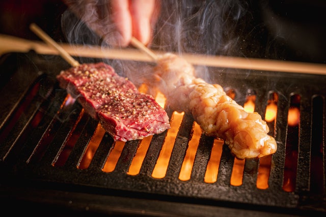 そのほか今回限定のコースには、ホルモンの串打ち二本、100gのハラミステーキ、キムチ、ナムル、スープ、ごはんなどがついた充実の内容に。
