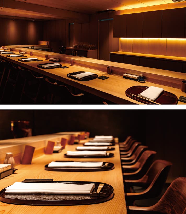 檜のカウンター席が洗練された佇まいを醸し出している。