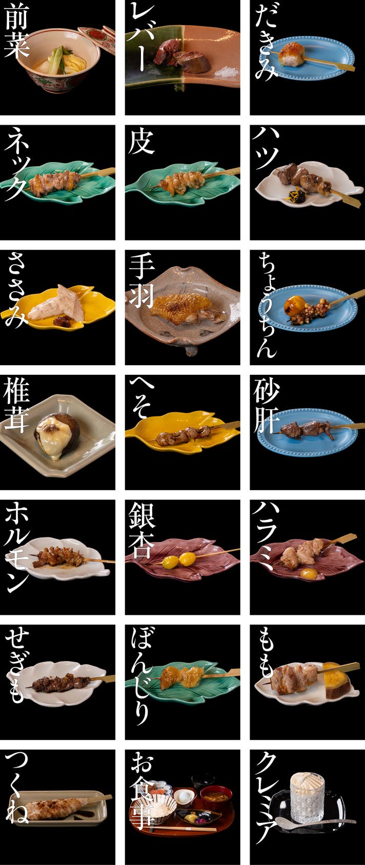 前菜 / レバーの炙り / だきみ / ネック / 皮 / ハツ / ささみ炙り / 手羽 / ちょうちん / 椎茸焼き / へそ / 砂肝 / ホルモン / 銀杏 / ハラミ / 背肝 / ぼんじり / もも / つくね / お食事 / 甘味