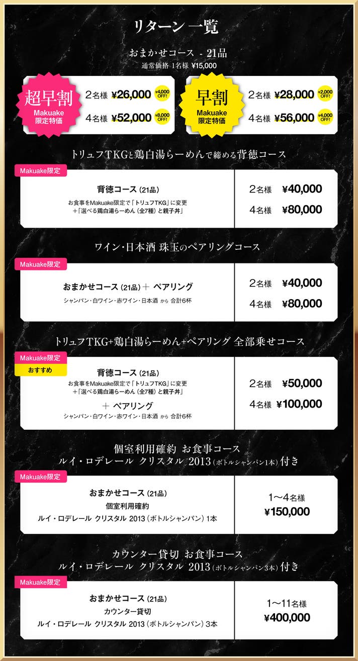 全21品のコース料理のうち、『お食事』として提供される通常の卵かけご飯をMakuake限定の『トリュフTKG』と『選べる鶏白湯らーめん(全7種)と親子丼』に変更。さらに、お家に帰ってからも焼鶏Sの余韻をお楽しみいただけるような「お土産」が付いております。