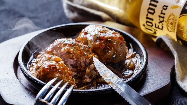 肉汁たっぷりのオールビーフハンバーグは切った瞬間にジュワッと肉汁があふれ出ます。特製のハンバーグソースでお召し上がり頂きます。