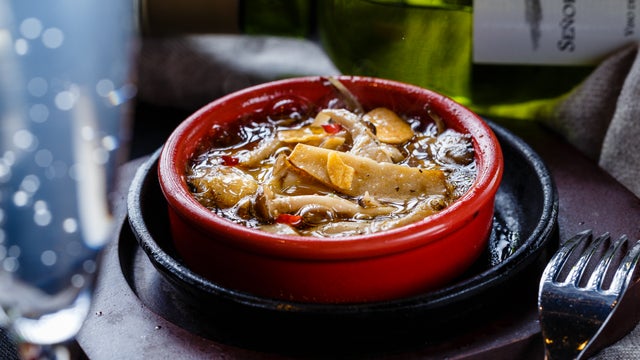 アヒージョはきのこ、カキ、大山鶏、牛ハツと野菜の4種類をご用意、オリジナルアヒージョソースは大人気!