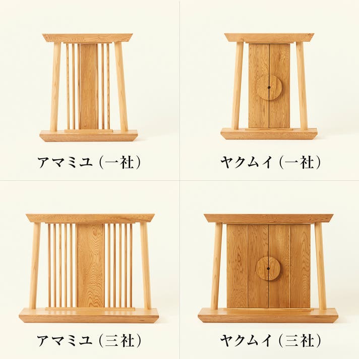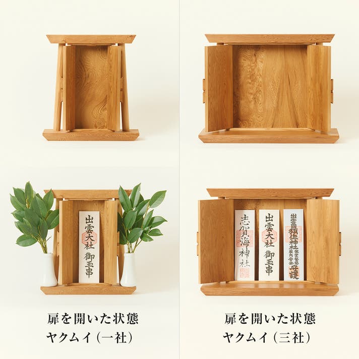 扉あり・なし、大・小の組み合わせから、ご家庭の空間や祀り方に合わせてお選びいただけます。