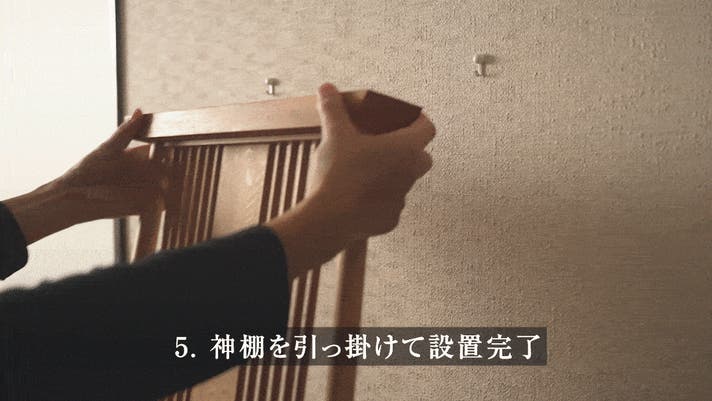 賃貸アパートやマンションでもお気軽に設置していただけるよう、石膏ボードピンフックを壁に取り付け、神棚を「ぶら下げる」スタイルで簡単に飾っていただけます。