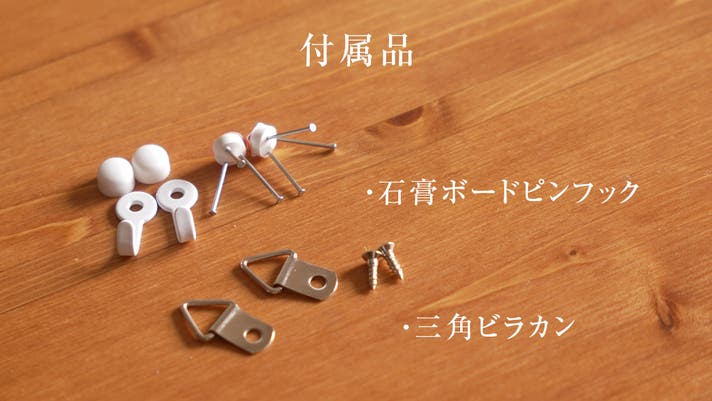 付属のビラカンと石膏ボードピンフックを使えば、簡単に取り付け可能です。