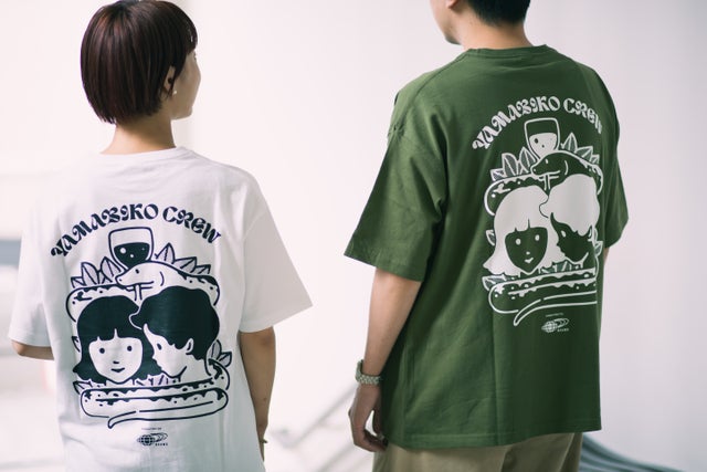 綿100%のビッグシルエットTは、モスグリーンとホワイトの2色。サイズはS~XLまで選べます。背面に「YAMABIKO CREW」アートワーク、前面左胸にやまびこの存続を願う「EVERLASTING ECHO(=止まないこだま)」のワンポイントをシルクスクリーン・プリント。