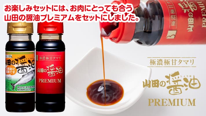 お楽しみセットには、お肉にとっても合う山田の醤油プレミアムをセットにしました。