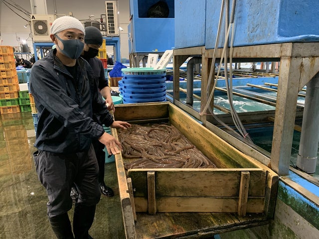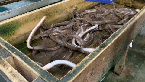 穴子の競り場へ。生け簀には、生きた穴子が入っている。