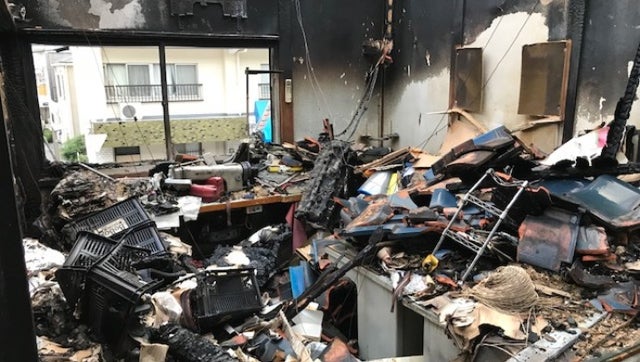 - 晴天の霹靂!8月9日「もらい火」により、6時間以上も燃え続けて工房が焼失。
