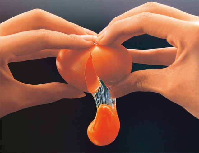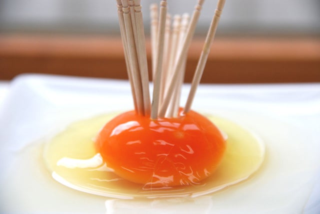 生の黄身に楊枝を指しても潰れていない。つまり、濃厚で弾力性がある証拠だ。