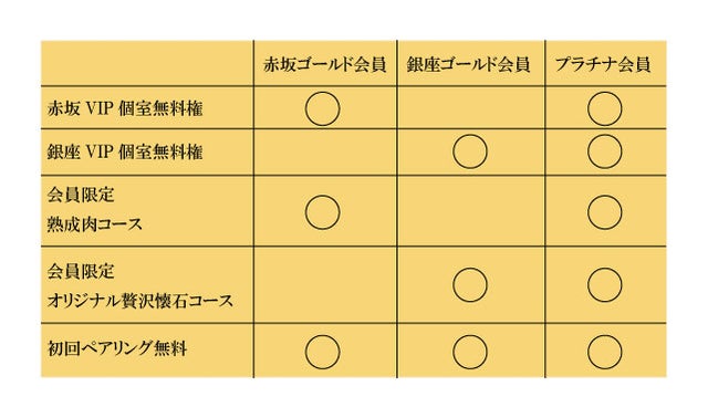 ご飲食代20000円分の利用券がついた【赤坂ゴールド会員】【銀座ゴールド会員】に加えて、両店舗のVIP個室が無料で利用できる【赤坂&銀座 共通プラチナ会員】の3つのリターンをご用意。