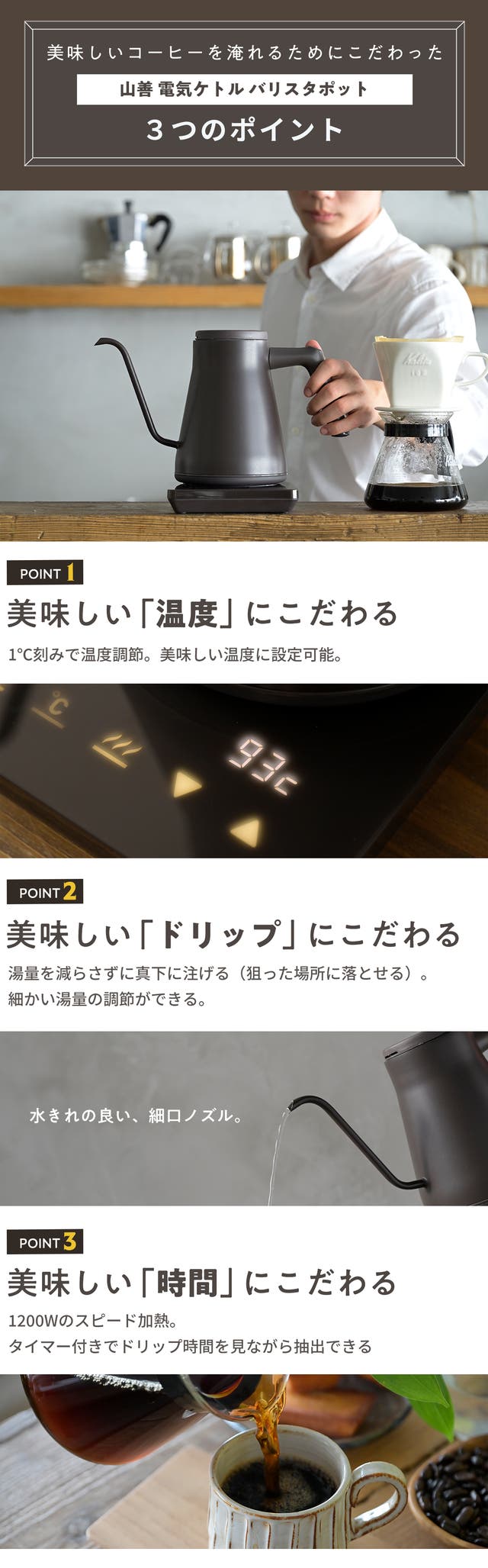 コーヒー愛好家に好評の山善電気ケトルから、「美味しいドリップコーヒーを淹れるため」にこだわったドリップコーヒーのための電気ケトル「バリスタポット」が誕生しました。