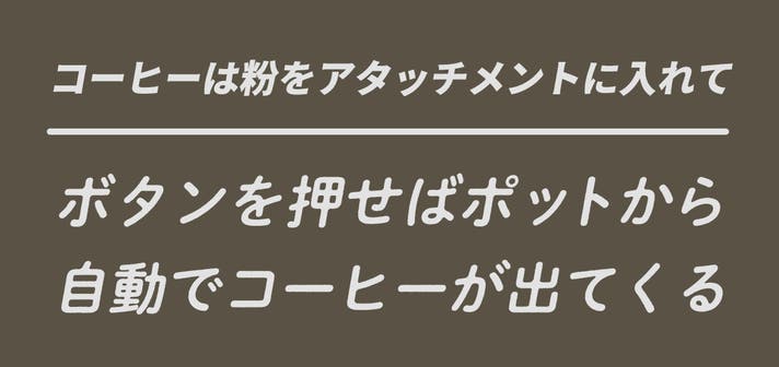 - コーヒー、お茶をポットからそのまま作れるアタッチメント付きで、ワンボタンで自動抽出
