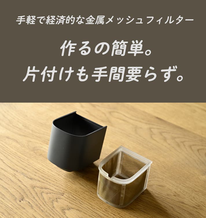 何度も使えて経済的な金属メッシュフィルター。金属製なのでそのままセットでき、後片付けもさっと洗うだけでラクラク。
