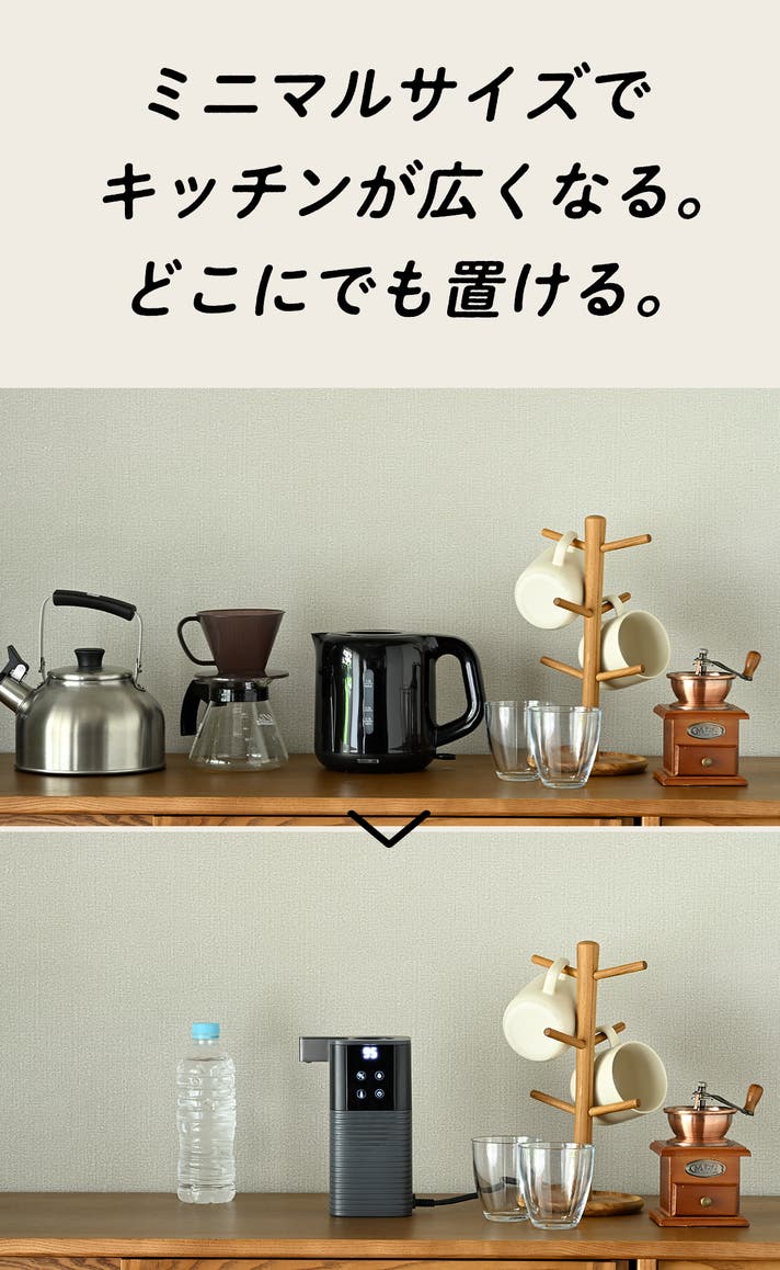 次世代電気ポット1台あれば、やかんも、電気ケトルも、電気ポットもコーヒーメーカーさえもいりません!なのに、ミニマルサイズ。だからキッチン周りがとってもスッキリ!キッチンが、家が広くなる!?