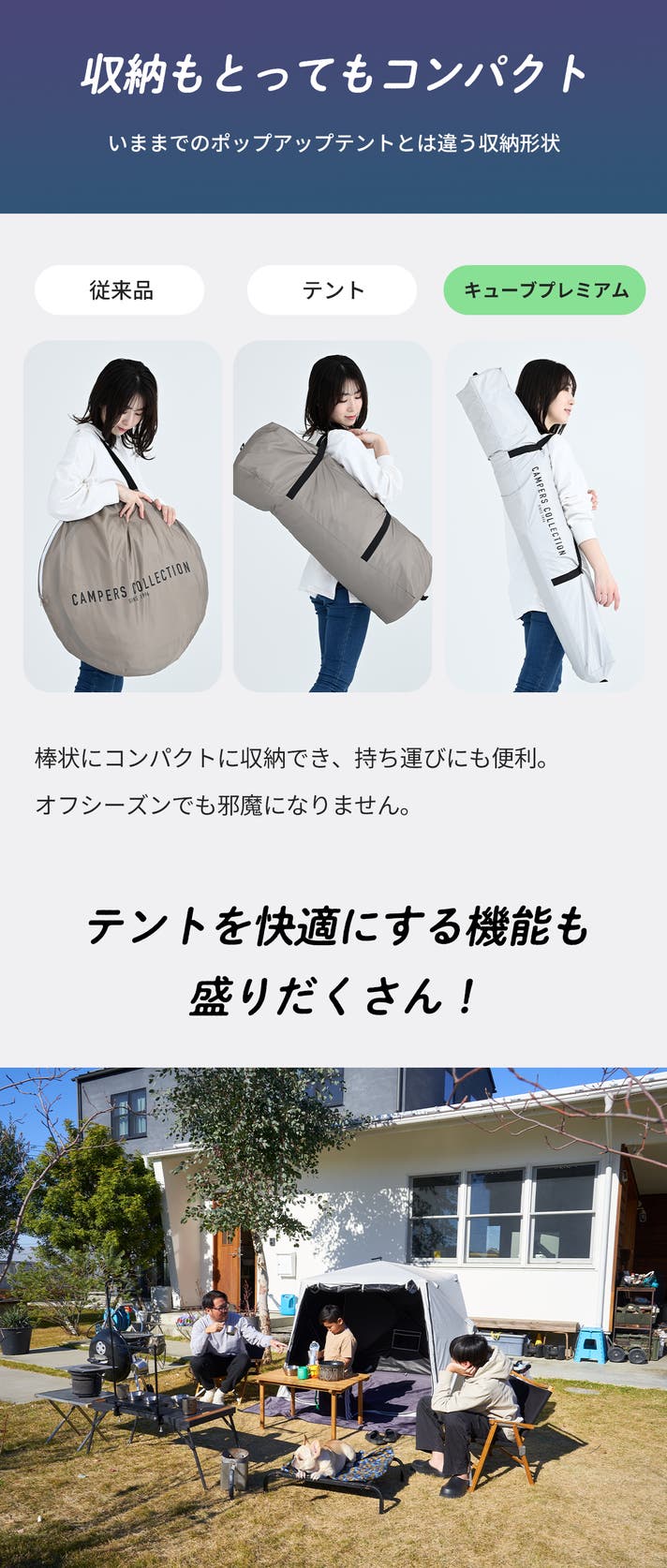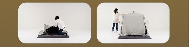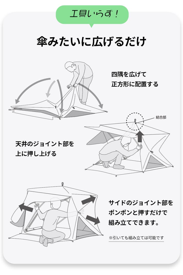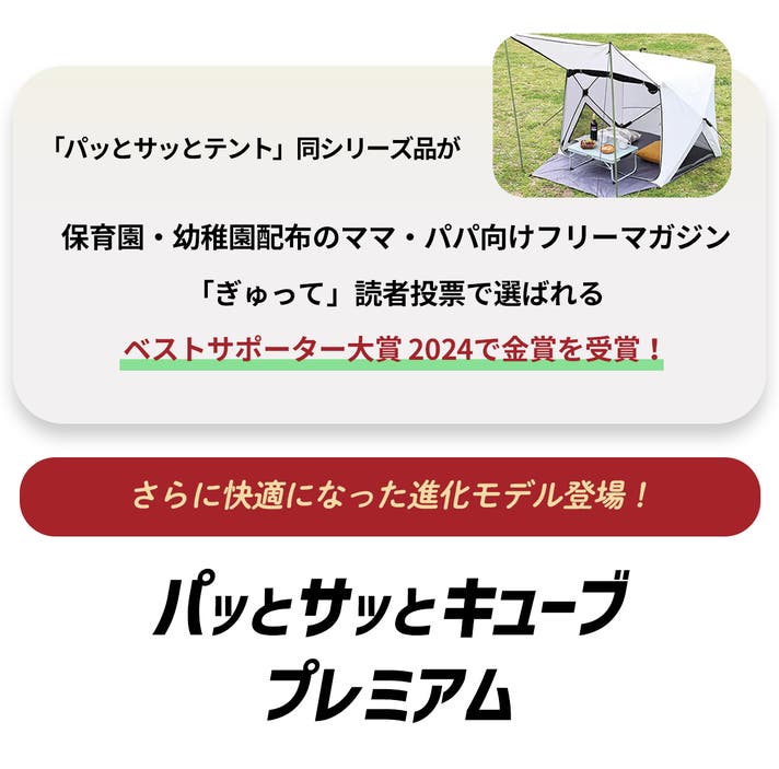 また、テントの形も従来は三角形で天井に向かうほど空間が狭くなり窮屈感がありました。本品はキューブ型(四角)なので空間が広く保てるため、家族で使用するときもスペースをしっかり確保できるようになりました。更に四角いテントは市場でもあまり多くなく、他の人と被らないところもポイントです。