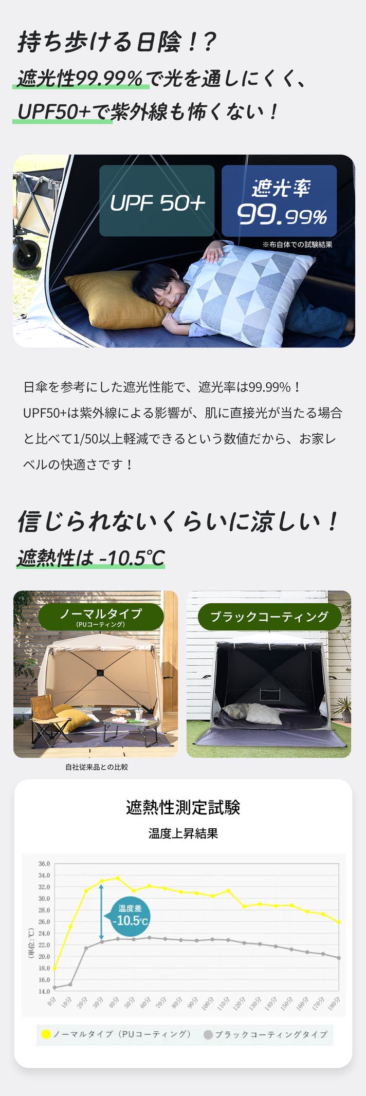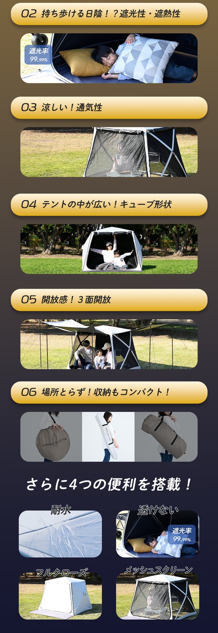 - 『遮熱&遮光』が抜群でキャンプ・ピクニック・ビーチでの着替え・休憩場所・紫外線&虫対策に!