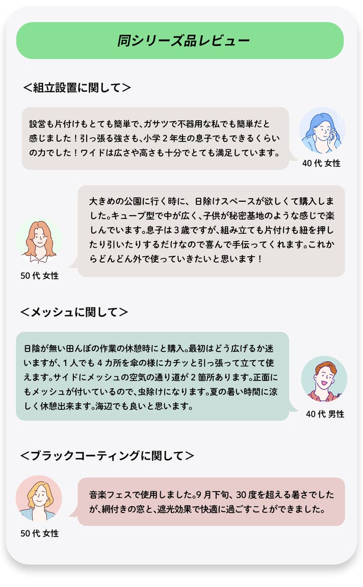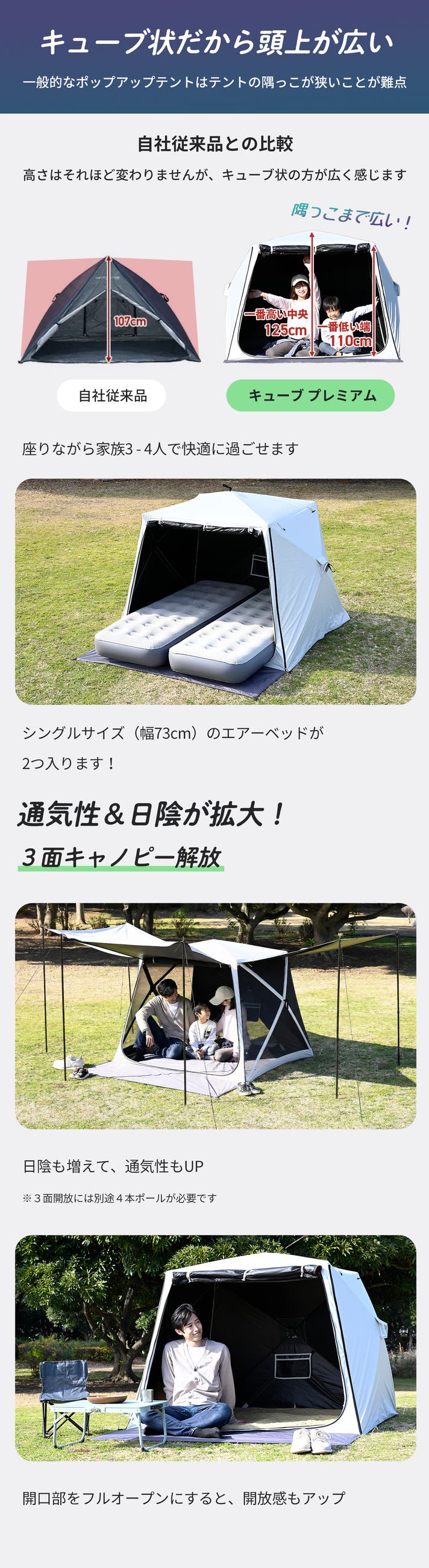 - キューブ型×3面開放で、テントの端でも頭上が広く【日陰の広さ】も【通気性】も格段にアップ