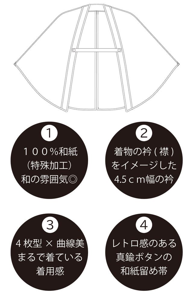 羽織でもマントでもない、とてもシルエットの美しい新ジャンルの羽織です。適当な名称がなかったので「肩掛け羽織」と新しく命名致しました。袖がないことに少し抵抗がある方もいらっしゃるかと思いますが、ごく普通の普段着として着られます。そして一目ではマントの様な形状だとはわからないのもポイントです。本当にサッと羽織れるのでちょっとした外出なんかもピッタリなのでぜひとも試していただきたい逸品です。和紙100%の生地で和を感じ、風にひらひらと舞う優美なファッションをお楽しみください。