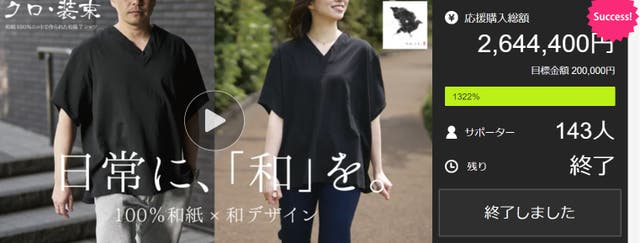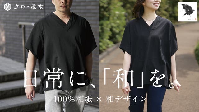 そしてこの「肩掛け羽織」、前回行ったプロジェクトの和紙100%で作った和風Tシャツ「クロ装束」との共演が可能です。今回この「クロ装束」をセットでのリターンをご用意致しました。「肩掛け羽織」は和紙100%の織物、「クロ装束」は和紙100%のニットで素材感が違うので、同時着用しても全く違和感がないどころか雰囲気がグッと増します。ぜひ一緒に羽織ってみてはいかがでしょうか。「クロ装束」は単体で着ても凄く雰囲気があるので、夏場に一枚で着るのもおすすめです。