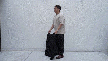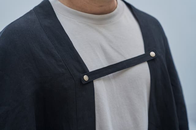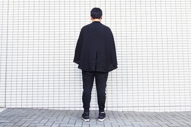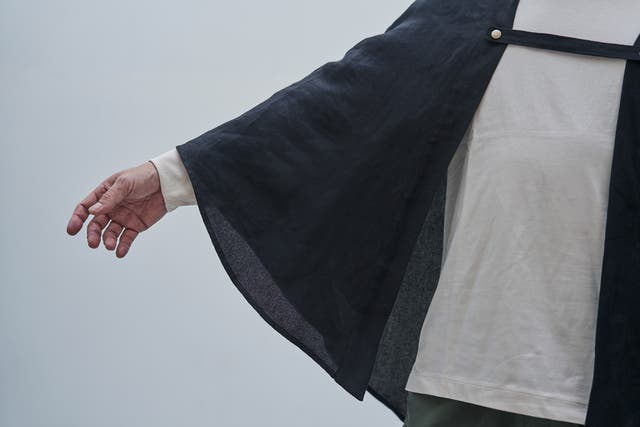 おひと方で着合わせる場合、「肩掛け羽織」と「クロ装束」共に同じサイズで合わせたらちょうどいいサイズ感になるように設定しています。細かい詳細は以前行った「クロ装束」のプロジェクトページをこちらから確認してください。今回の「肩掛け羽織」とは生地が違うので、特に洗濯と製品の取り扱いだけはしっかり確認してください。当時からの追加情報で、推奨は致しませんが低温での乾燥機であればほぼ製品は縮まないことを確認しております。