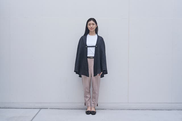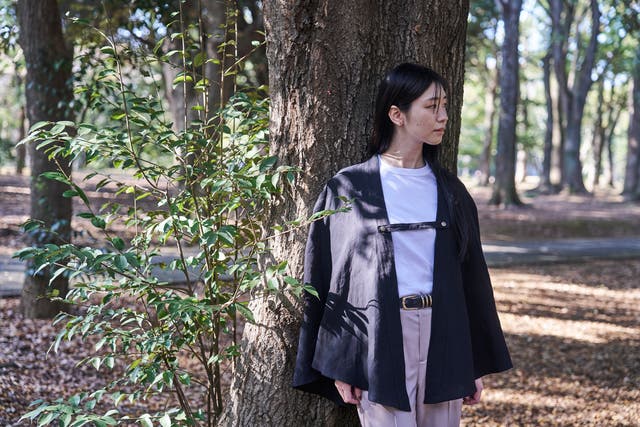 和紙100%で羽織のような和を感じながら、ちょっとした動作で風にひらひらなびく、和×優美なデザイン。和の羽織×肩掛けスタイル(カーディガンの肩掛けのような)なので、今回の試作アイテムを「肩掛け羽織」と命名しました。
