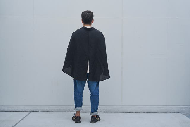 でもそんな弱点なんか、一度羽織ればわかります。着るだけでとても雰囲気がでます。そして一目ではマント形状だとはわからないので奇抜にも見えないところがポイントです。本当にサッと羽織れるのでちょっとした外出なんかもピッタリですし、普通に飲みに行ったりするときも着用できます。電車も乗れますし、旅行にも行けます。若干腕の可動域が気になりますがスーパーでの買い物も普通にできます。冷房の効きすぎたカフェなどでPCの作業をする場合なんか必須アイテムです。風でずれるのではないか心配な方もいると思いますが、よほどの風が吹き続けない限りは大丈夫(※体型にもよる)です。試作の段階で全て試しました。