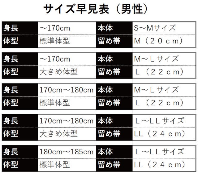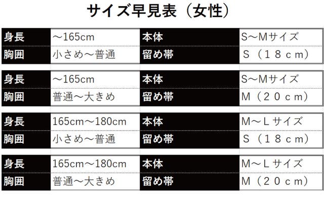女性の場合、基本的にはS~Mサイズ。165㎝以上の方や体型によってM~Lサイズを着用してください。本体がオーバーサイズでもきちっと留め帯で支えられることが大事です。