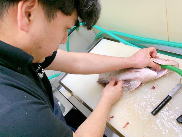 津本光弘氏が考案した血抜きの技法で、全国の名だたる名店が活用している。血は旨味であり香りでもあるが、鮮度が落ちると匂いとなり変色を促してしまう。