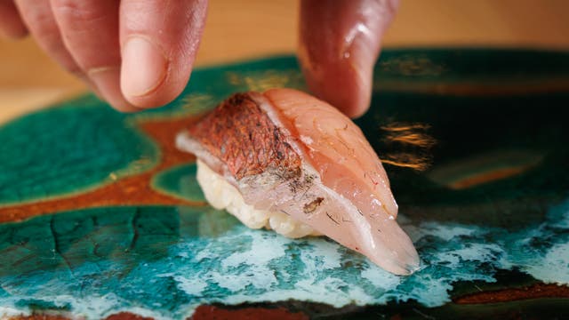 皮に炭を直接押し当てて焼き目を入れることで、炭の香りとネタの香りをマッチさせた絶品の『金目鯛炭たたき』