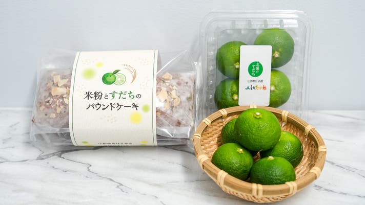 山形産「北限のすだち」8-10個と「米粉とすだちのパウンドケーキ」の2種類です。