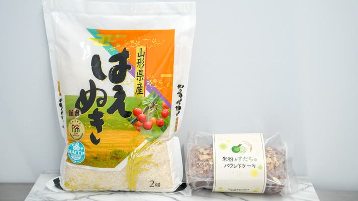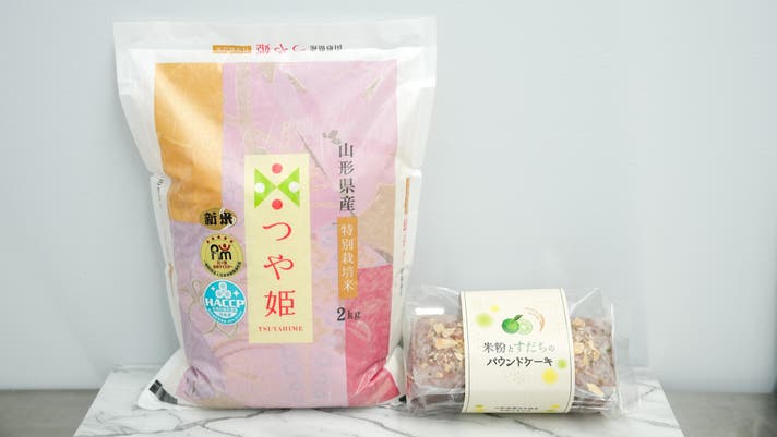 3.【早期リターン限定】やまがたセット(米2種類のキューブ各2合、米粉300g、すだち100g、パウンドケーキ 1本を詰めこんだセット)