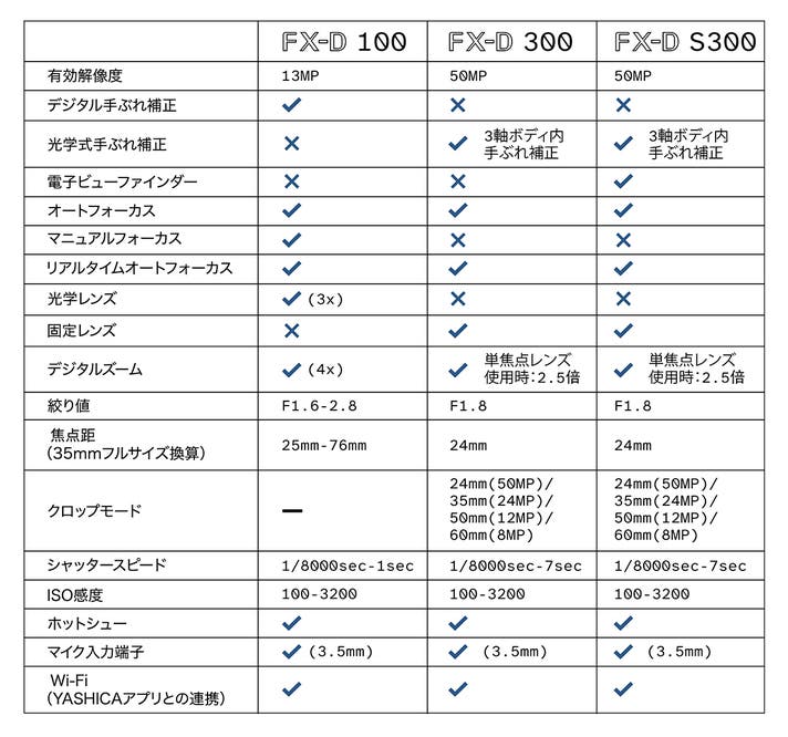 手ブレ補正: デジタル手ブレ補正(FX-D 100)、3軸IBIS 、光学手ブレ補正(FX-D 300 & S300)