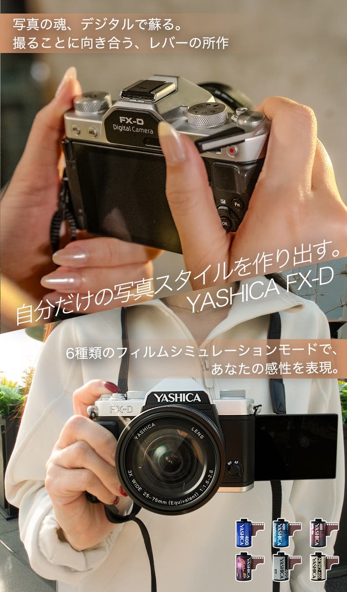 YASHICA FX-Dは、アナログの魅力とデジタルの利便性を融合させた新世代のフィルムシミュレーションカメラシリーズです。名機YASHICA FX-3へのデジタルオマージュとして誕生し、フィルムの普遍的な魅力をデジタル時代に蘇らせます。